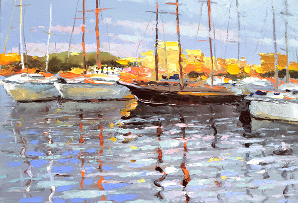 El amplio paisaje marino está lleno de vida con la actividad de varias embarcaciones que navegan con gracia por las aguas. Bajo el cielo azul claro, el sol proyecta una luz brillante y dorada que baila sobre las suaves olas, creando un efecto centelleante en el mar.