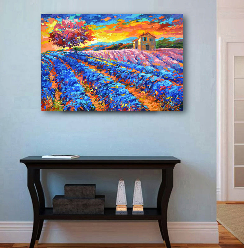 Esta pintura impresionista de un campo de lavanda combina la naturaleza y el diseño contemporáneo, lo que la convierte en el complemento perfecto para su espacio. Sus tonos fríos y formas orgánicas añadirán un toque fresco y elegante a cualquier habitación, manteniendo al mismo tiempo una sensación de armonía y equilibrio.