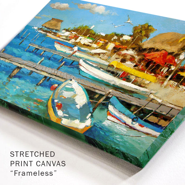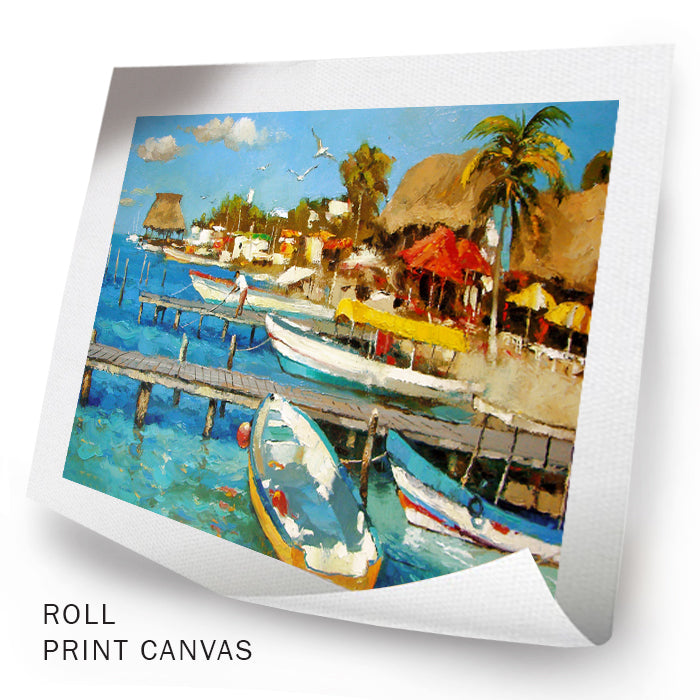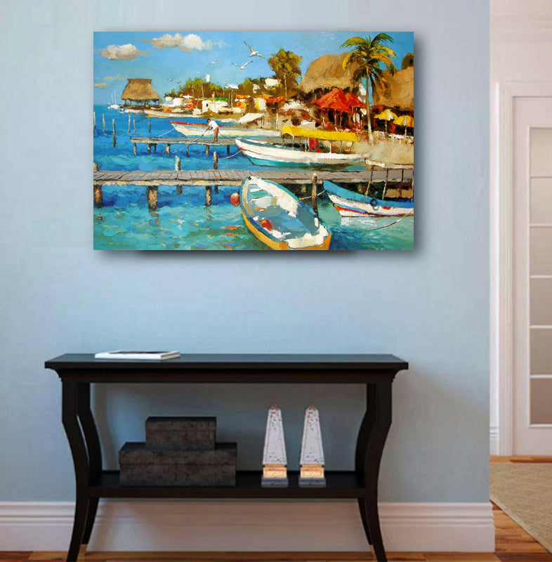 PINTURA de paisajes marinos, barcos de pesca y playa