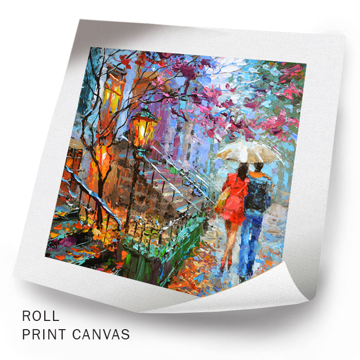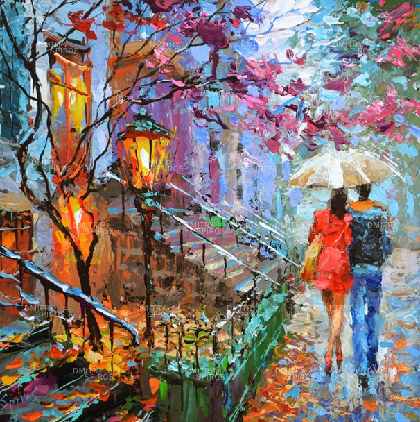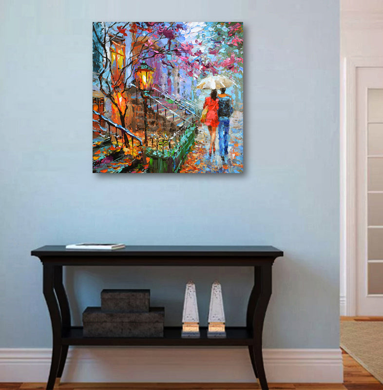 Pintura sobre lienzo de paisaje urbano en una tarde lluviosa