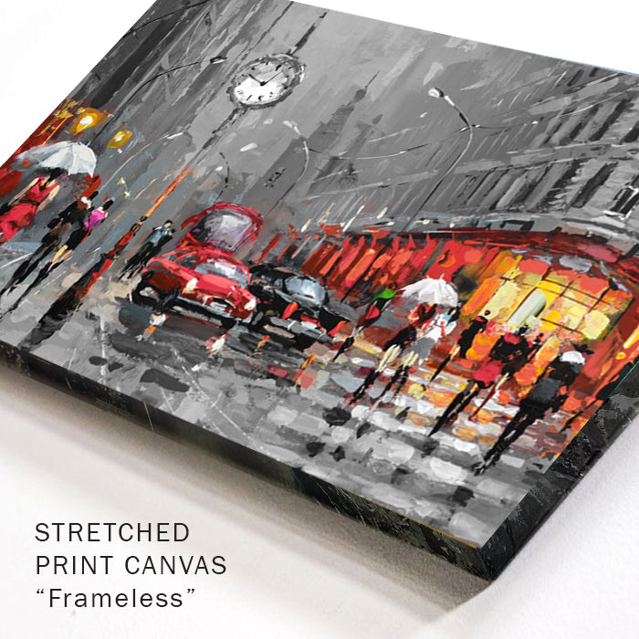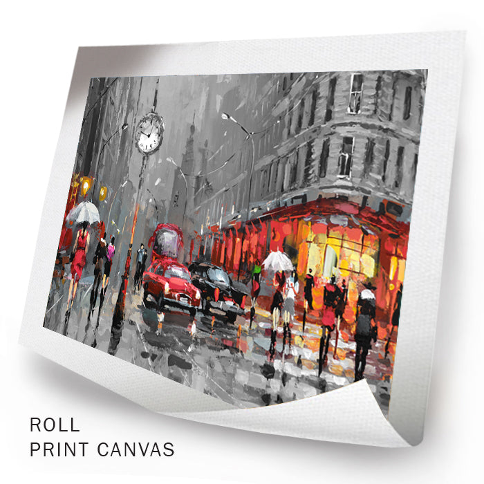El fuerte contraste entre el blanco y el negro resalta las líneas y sombras dramáticas de la ciudad, resaltando los reflejos en el pavimento mojado y el movimiento sutil de los transeúntes. Esta pintura ofrece una calidad cinematográfica atemporal que atrae al espectador hacia la elegancia tranquila de una ciudad bulliciosa por la noche.