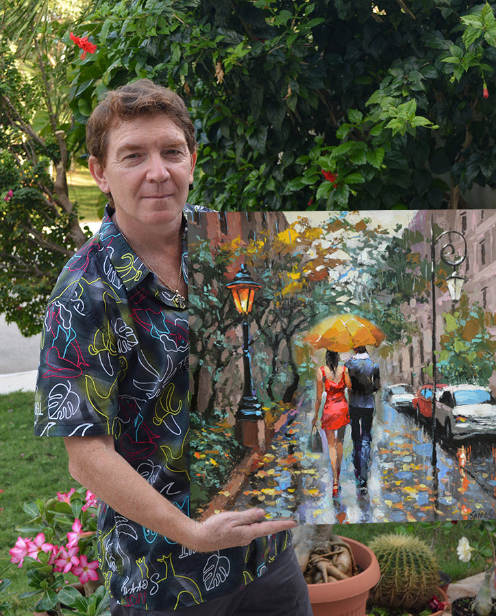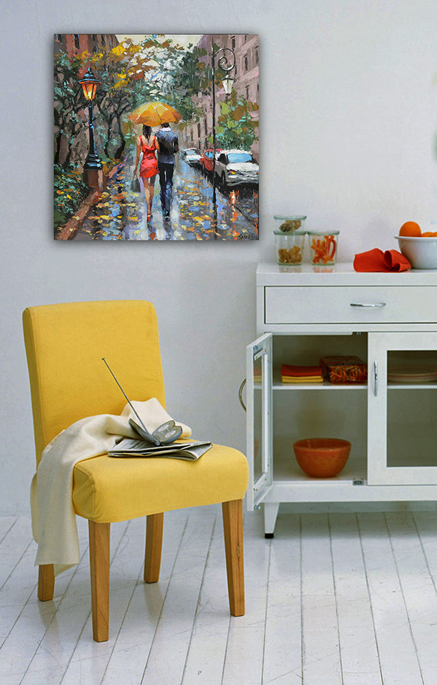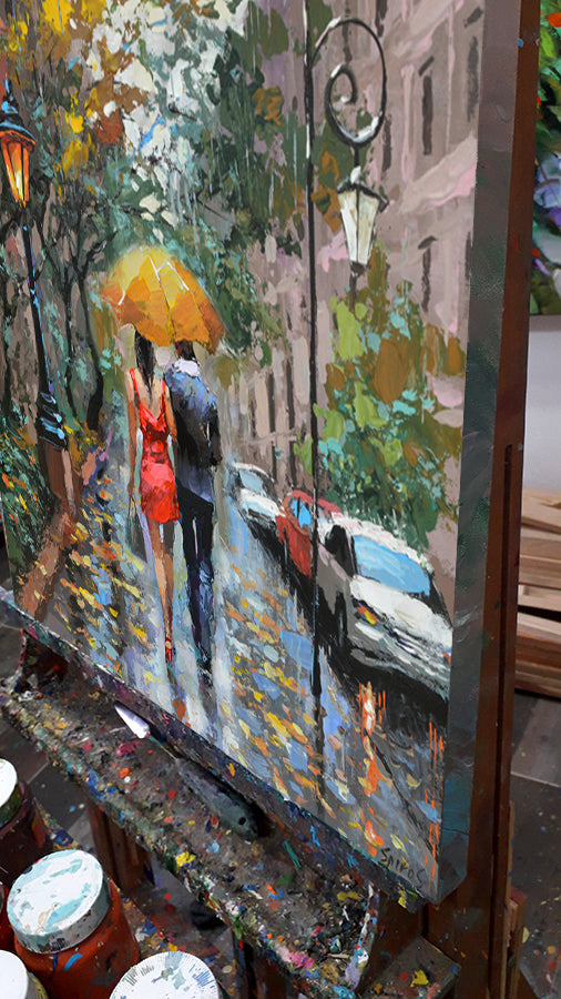 This romantic autumn painting portrays a couple in love walking together under an umbrella on a soft early autumn day. Gentle rain, muted colors, and quiet city streets create an intimate and emotional atmosphere. This original artwork by contemporary artist Dmitry Spiros captures warmth, connection, and the poetry of rainy moments, making it an ideal choice for lovers of romantic wall art, autumn cityscapes, and atmospheric interiors. Suitable for living rooms, bedrooms, and cozy spaces. Worldwide shipping available.
